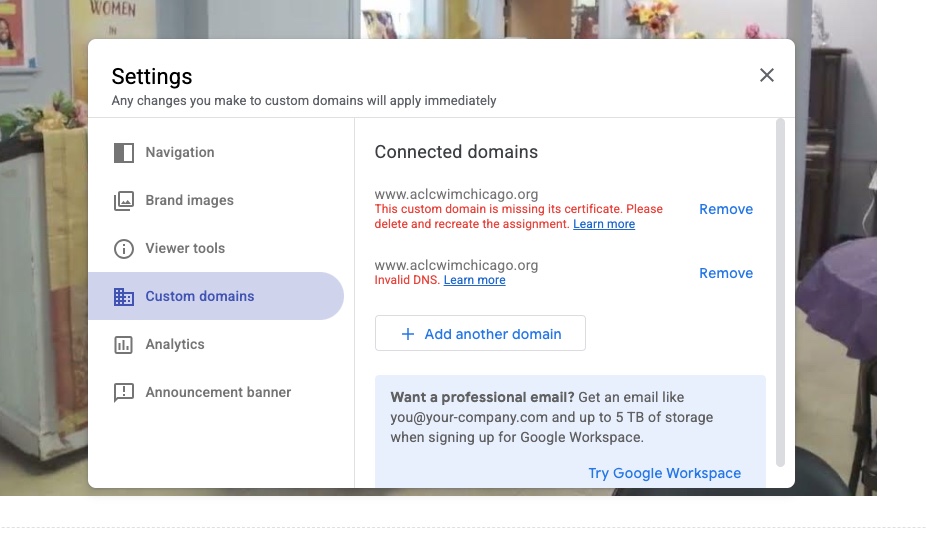 I have set up my custom domain for a long time on this google site, but when i switched Domain Name hosting it won't work, no matter how many times I remove it and put it back . It keeps saying missing Certificate.