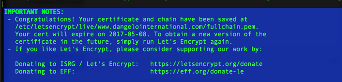 You’ve used the webroot plugin in certonly mode. certonly means the client (letsencrypt, now known as certbot) will only obtain the certificate and store it on disk for you (in /etc/letsencrypt/live/www.dangelointernational.com in your case). The missing step is adding some configuration to your existing web server to enable SSL/TLS and start using the certificate and private key generated by the client.