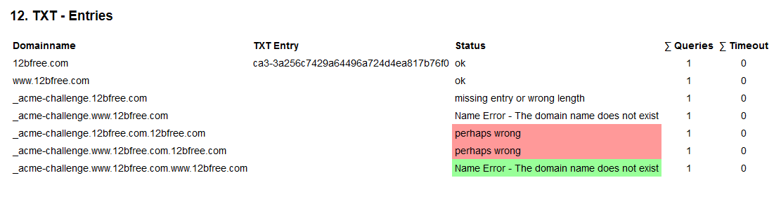 Everythingâs fine, except for point 12 "TXT Entries, where it says âperhaps wrongâ for â_acme-challenge.12bfree.com.12bfree.comâ and â_acme-challenge.www.12bfre e.com.12bfree.comâ