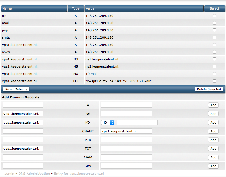 I use DirectAdmin. When i look at my DNS settings everything points to my IP-adress. I just told my registrar to point the domain via AA records to my IP-address of my VPS. (Because it’s not possible in there control panel to do it yourself)